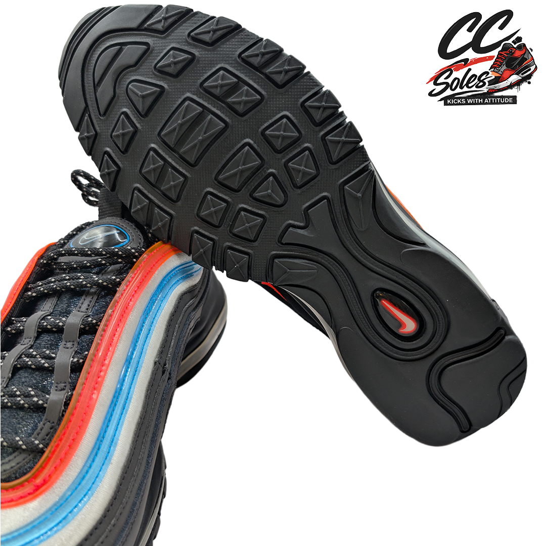 Released in 2019, the Air Max 97 “Neon Seoul” originated from the Nike: On Air contest. The competition brought together thousands of people to workshops ranging from New York City, Paris, London, Tokyo, Shanghai and Seoul, and allowed them a chance to create an Air Max design inspired by their communities. 18 finalists were narrowed down to six winners, and the pair featured was created by Gwang Shin. The design represents her hometown of Seoul, South Korea, and takes inspiration from the city’s famed neon signs. The pair features vivid orange and Blue Lagoon piping on a black, wavy leather upper, and is finished with a contrasting red Swoosh and a full-length Max Air unit.